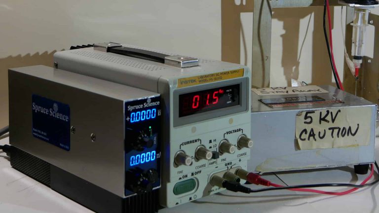 Having an adjustable high voltage switch mode power supply is great for ESI tuning of the high voltage parameter to balance with pumping rate. To generate intense electric fields, high voltage is applied to the hypodermic needle that is 1.2mm in diameter. The physical gap between the needle tip and ground plate is 20mm.